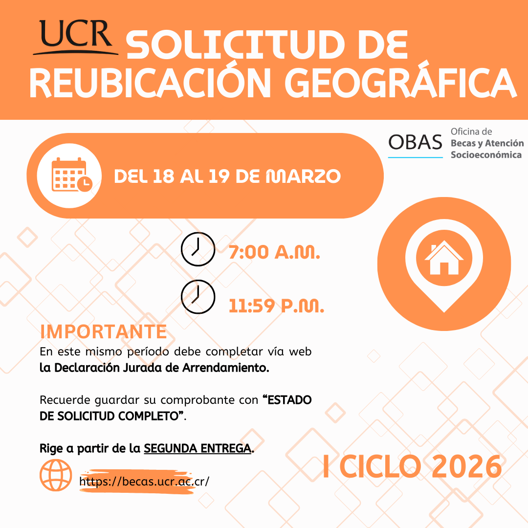 UCR habilita periodo para solicitar reubicación geográfica de beca La Oficina de Becas y Atención Socioeconómica (OBAS) informa a la población...