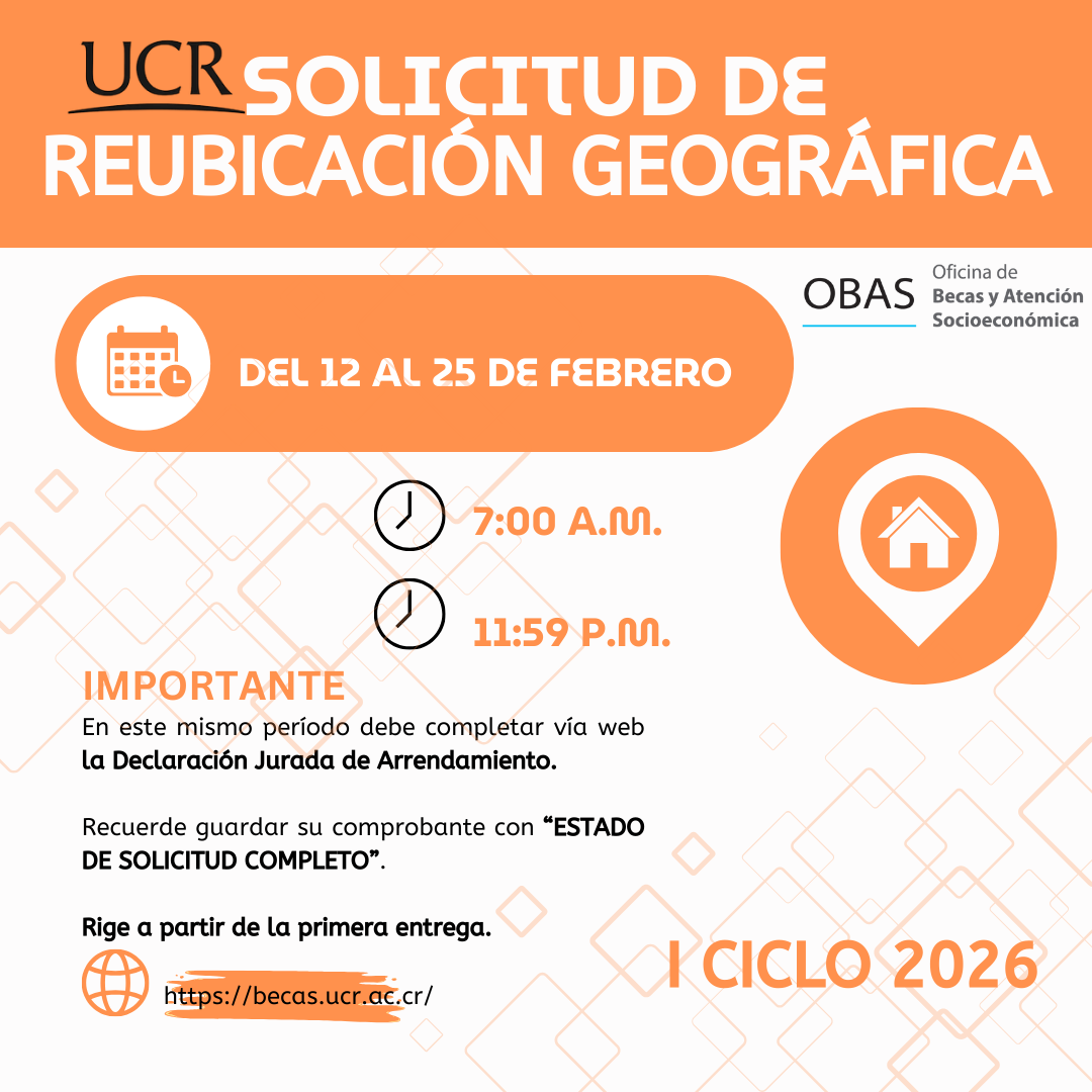 UCR habilita periodo para solicitar reubicación geográfica de beca La Oficina de Becas y Atención Socioeconómica (OBAS) informa a la población...